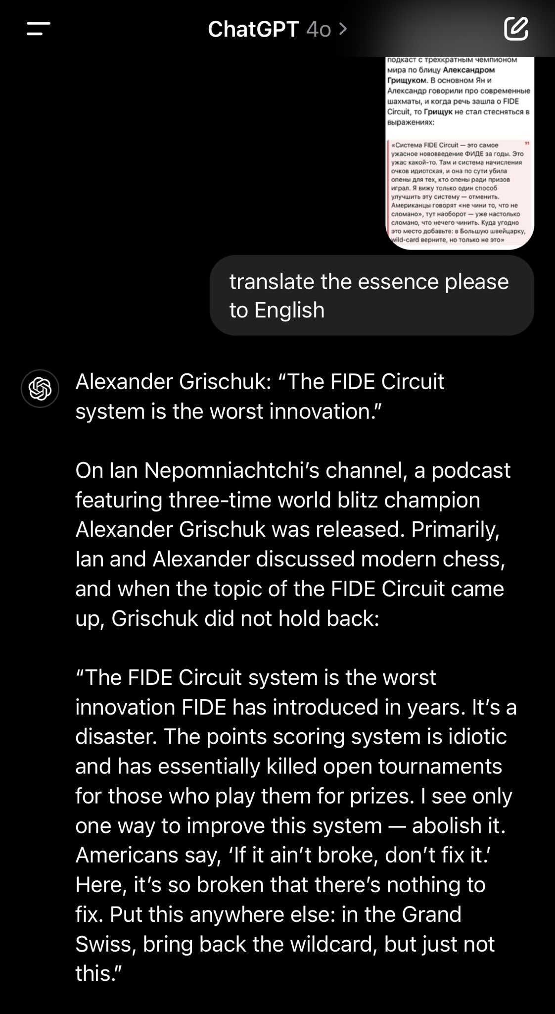 «Система FIDE Circuit — худшее нововведение, которое ФИДЕ представила за последние годы. Это катастрофа. Система подсчета очков идиотская и по сути убила открытые турниры для тех, кто играет в них ради призов. Я вижу только один способ улучшить эту систему — отменить Американцы говорят: «Если оно не сломано, не чините его. Здесь оно настолько сломано, что больше нечего чинить. "