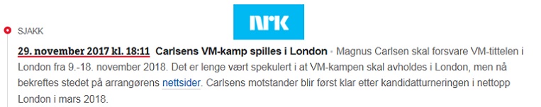 Jacob08: В рамках открывающегося турнира London Classic Chess предполагается проведение пресс-конферении в среду 29 ноября с презентацией Лондона как место проведения следующего Матча на первенство мира в ноябре 2018 года.