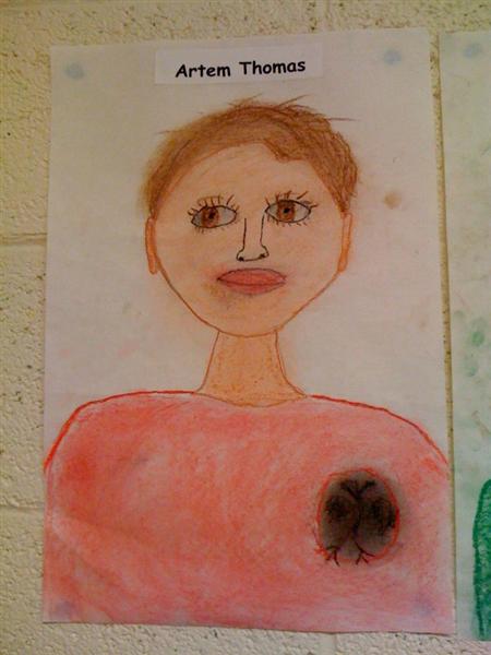 Я на этой неделе ходил на родительское собрание, сфотографировал автопортрет в классе на стенке.