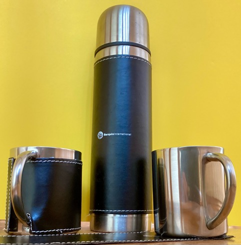 И у меня есть набор термоса с кружками, и все это в кожаных защитных липучках (одну я снял), и весь набор в кожаной сумке. Это жена когда-то на работе выиграла в рождественскую лотерею.