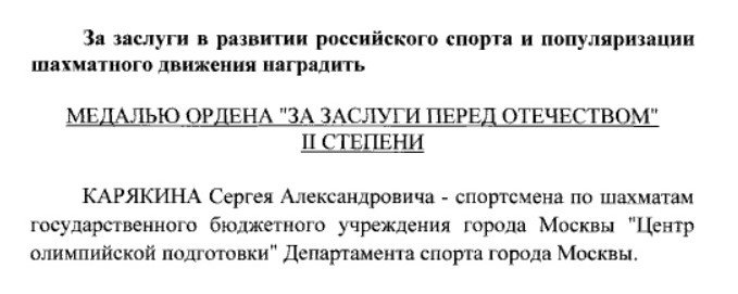 | Evgeny Gleizerov: Вопрос, конечно, интересный. Беглое гугление дало только сообщение о первой степени в 2019 и ордене Дружбы в 2021. Но за Россию она до этого много чего навыигрывала - Олимпиаду, командные чемпионаты Европы и мира... Так что где-то могли и дать. |
