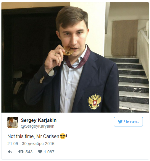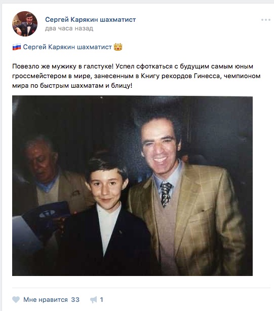 "Я принимаю предложение по нескольким причинам. Во- первых, я очень уважаю Владимира Владимировича Путина и как сильного президента, и как человека, который многое делает для развития шахмат, посещает шахматные турниры, поддерживает шахматистов. Поэтому, учитывая, что предложение я получил лично от него, отказываться считаю неправильным. Во-вторых, я как шахматист-профессионал считаю необходимым популяризовать шахматы, где бы ни находился", - сказал Карякин.