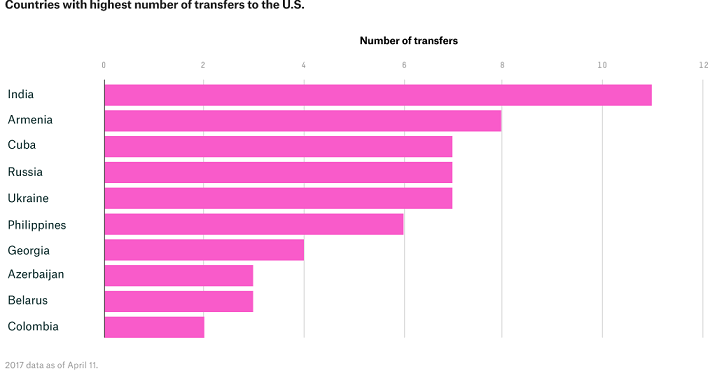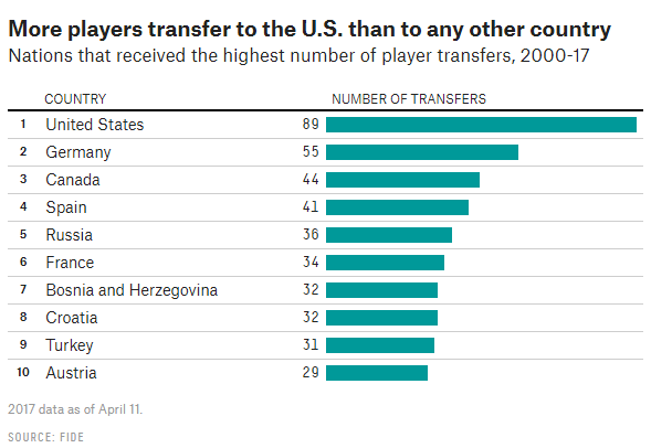 Есть и список "поставщиков" гроссмейстерских кадров в США. И возглавляет его отнюдь не Индия (которая при ее 11-ти трансферах в США поскупилась хотя бы на одного гроссмейстера - ноль).