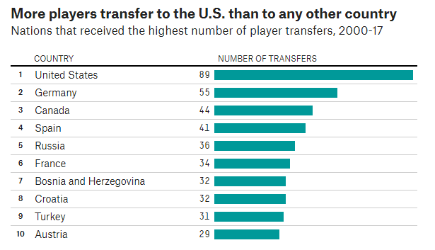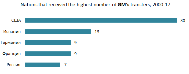 Указаны первые пять стран (федераций), всего же "гроссмейстерских" переходов с 2000 года - 175. Подчеркну, что это именно количество трансферов, число же гроссмейстеров, менявших федерацию, несколько меньше - ввиду повторных переходов (включая "обратные").