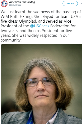 This is a sad news for US chess community. Ruth was one of the most dedicated chess promoters and supporters on every level...She supported me in my transition to US chess. I will always remember you...RIP |
