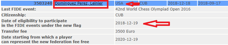Во-вторых, по получении заявления ("Уведомления о смене федерации") ФИДЕ информирует о нем "старую федерацию" и не позднее 90 дней после этого принимает решение, публикуя информацию о трансфере. Но трансфер не опубликован до сих пор. А незадолго до мемориала Капабланки (то есть совсем недавно) я давал ссылку на кубинский источник, из которого следует, что высокопоставленный чиновник кубинской федерации лишь предполагает возможное желание Домингеса сменить федерацию. |