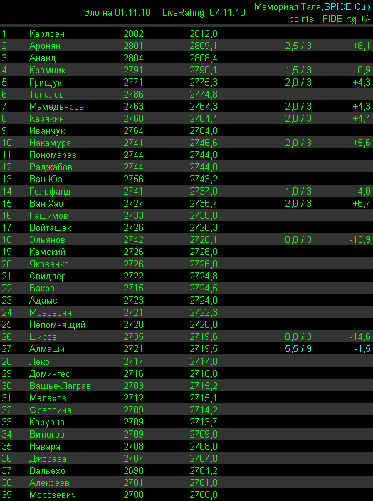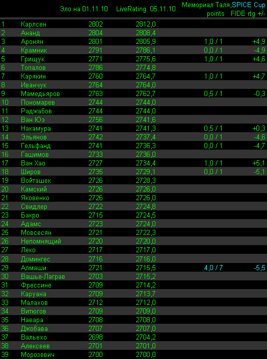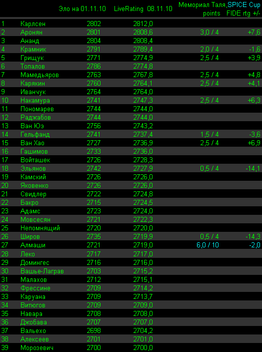 Теперь Мемориал Таля - как наш ответ Чемберлену на Нанкин. Там трое сильнейших (+2800): Ананд, Топалов и Карлсен, а у нас последующие трое сильнейших (по циферкам, а по силе - сложный вопрос) Аронян, Крамник, Грищук. |