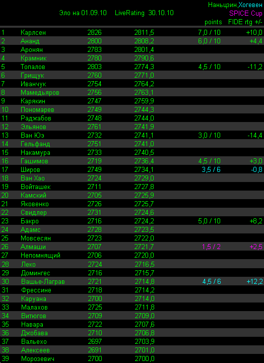 ФИДЕ сама дискредитирует свой рейтинг. Уже то, что Нанкин не обсчитан на 1 ноября - не делает чести мировым шахматам, что бы там ни было записано у ФИДЕ в правилах по срокам обсчета турниров. Турниры, влияющие на верхушку рейтинга должны обсчитываться в ближайшем листе, и это несложно формализовать в виде правила - если бы там было кому писать адекватные правила. Но команду ФИДЕ просто и элементарно не интересует имидж мировых шахмат. Это люди с совершенно другими приоритетами.