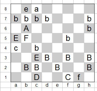 6. ... Фd8-c7 7. Kc7-e8+ Фh8-d8 8. f5-f6 Фе5-h8 9. f4-f5 Фе1-е5 10. f3-f4 e2-e1Ф 11. f2-f3 f3:Ke2