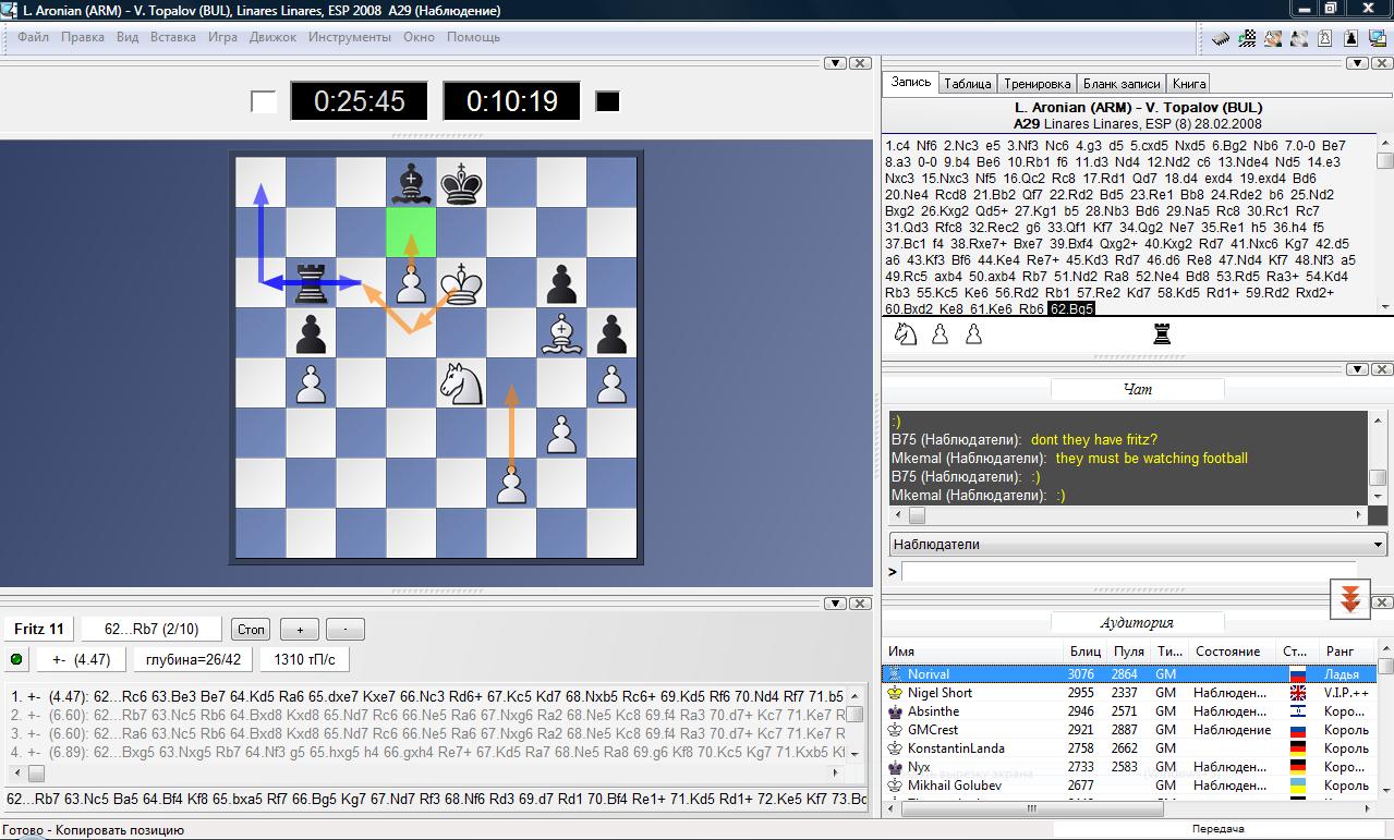 К слову, думаю нечестно ругать Топалова что не пошел 39...Bd6 с преимуществом... он же в цейтноте этот ход просто не нашел... никого не надо убеждать, что так лучше, такое без времени надо увидеть...