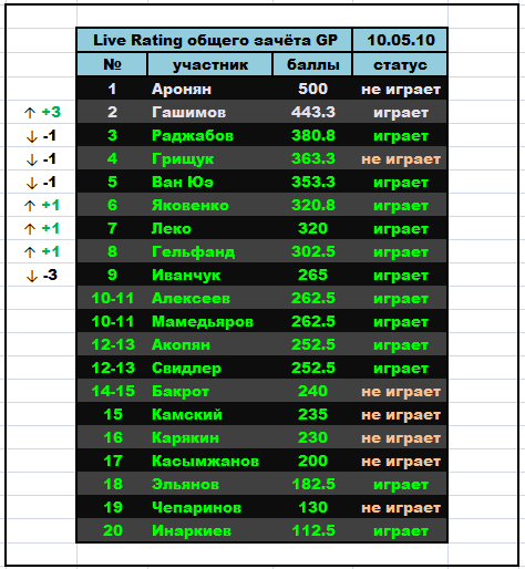 | Яковенко-Гашимов, Раджабов-Инаркиев, Иванчук-Ван Юэ-ничья. Гельфанд-Мамедъяров-1-0. |