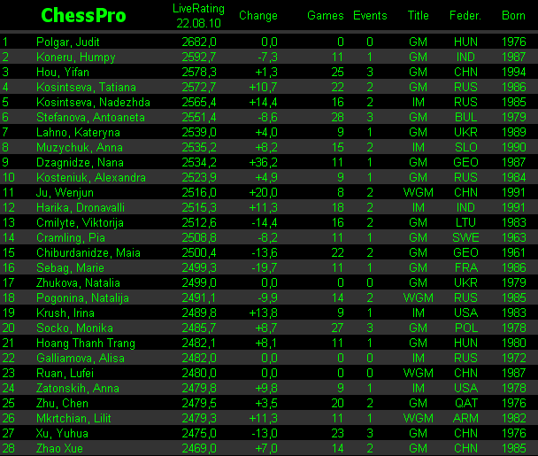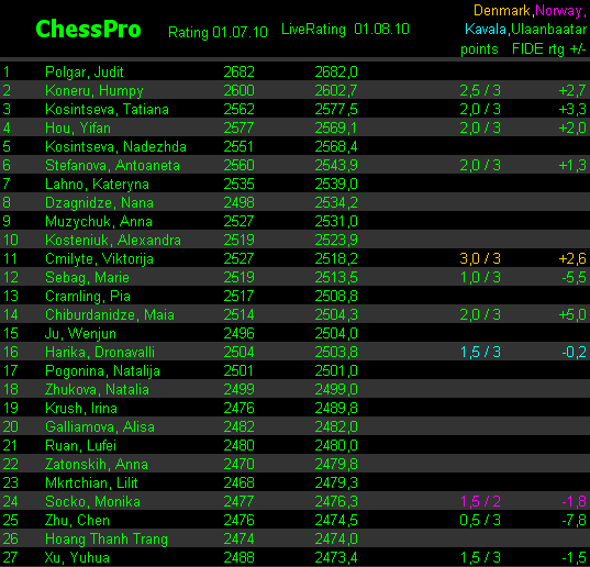 Women's Grand Prix - Ulaanbaatar(Rounds 1-4 of 11)[ Koneru,Hou Yifan, T. Kosintseva, Stefanova, Sebag, Chiburdanidze, Xu Yuhua, Zhu Chen, Zhao Xue ]