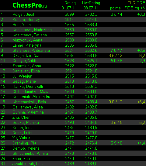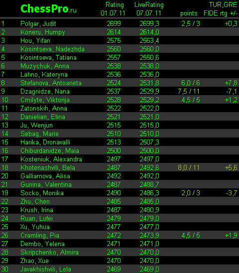 European Woman Chess Championship ( 11 rounds ) [ Kosintseva N., Kosintseva T., Dzagnidze, Muzychuk A., Lahno, Kosteniuk, Danielian, Stefanova, Cmilyte, Muzychuk M., Khotenashvili, Cramling, Mkrtchian, Ushenina, Arakhamia-Grant, Hoang Thanh, Gaponenko, Javakhishvili, Pogonina ]