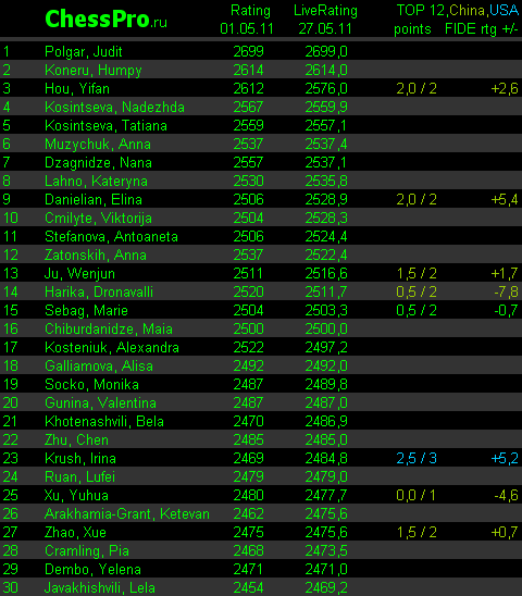 2011 Chinese Chess League Division A - R4,R5 (Rounds 1-2 of 3 ) [Hou Yifan,Danielian,Harika Dronavalli,Ju Wenjun,Zhao Xue,Xu Yuhua,Shen Yang ]
