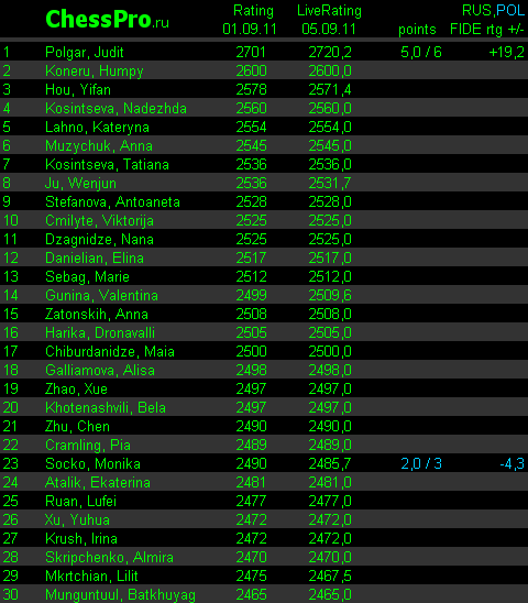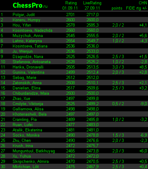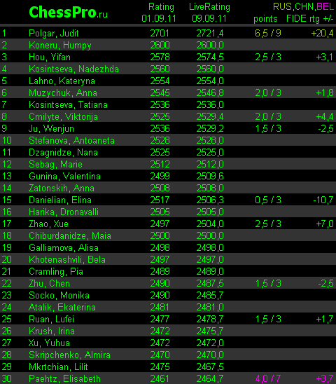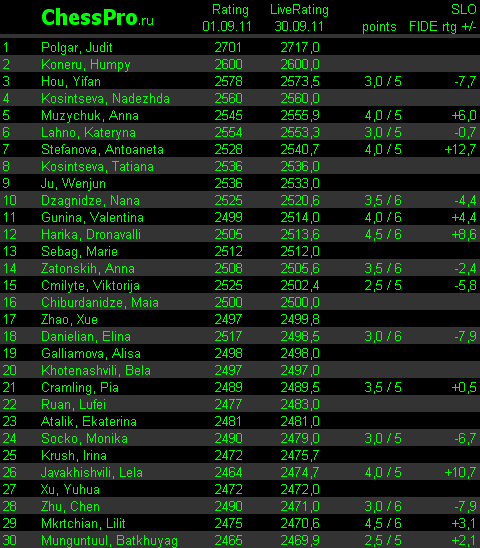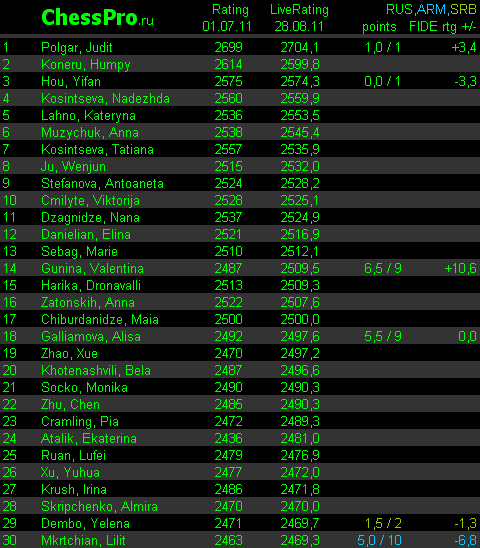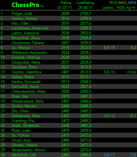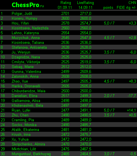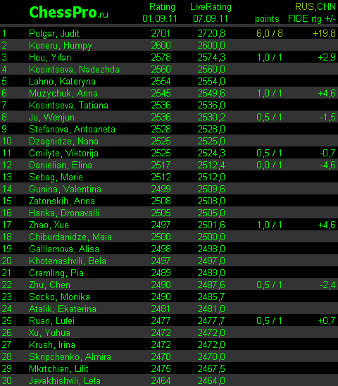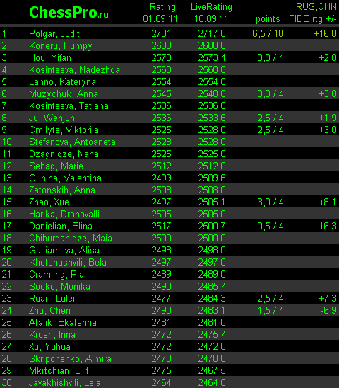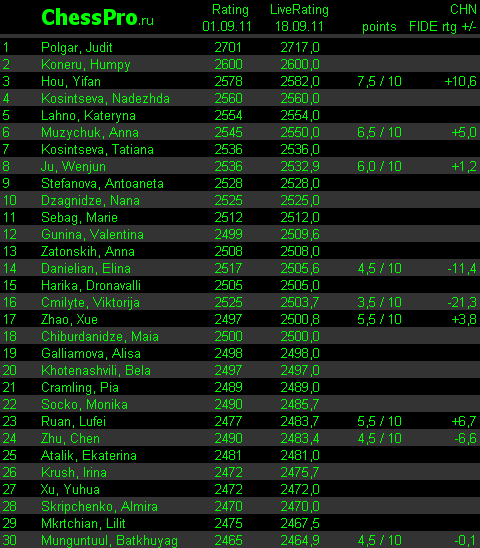 Women's Grand Prix Shenzhen (11 rounds) [ Hou Yifan, Muzychuk Anna, Ju Wenjun, Cmilyte, Danielian, Zhao Xue, Zhu Chen, Ruan Lufei, Munguntuul ]