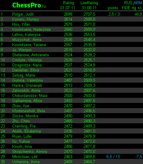 European Club Cup (Rounds 1-2 of 7 ) [ Hou Yifan, Anna Muzychuk, Lahno, Dzagnidze, Stefanova, Gunina, Zatonskih, Danielian, Harika Dronavalli, Cmilyte, Cramling, Socko, Zhu Chen, Munguntuul, Skripchenko, Mkrtchian, Dembo ]