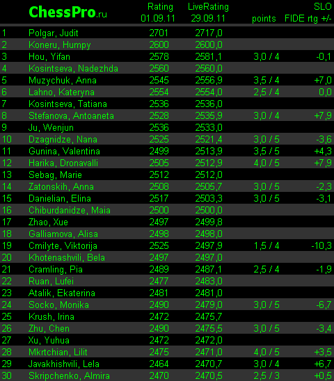 European Club Cup (Rounds 1-4 of 7 ) [ Hou Yifan, Anna Muzychuk, Lahno, Dzagnidze, Stefanova, Gunina, Zatonskih, Danielian, Harika Dronavalli, Cmilyte, Cramling, Socko, Zhu Chen, Munguntuul, Skripchenko, Mkrtchian, Dembo, Javakhishvili ]