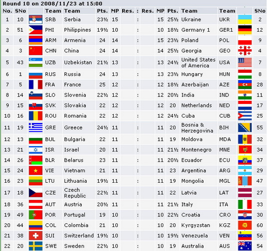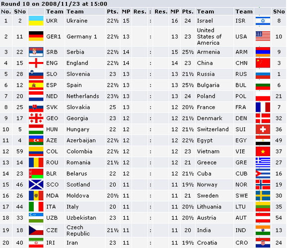 | Anmar: Интересно вышло у Израиля,вышел на второе место не сыграв ни с одним серьезным противником. Ставлю завтра на Ароняна, пора и ему сыграть в полную силу. Итог будет 3:1 в пользу Армении. |