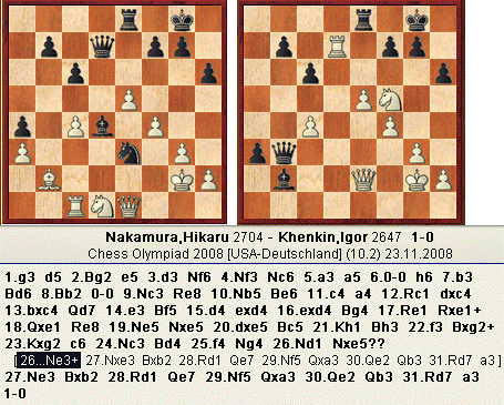 Наверно ошибка в трансляция : не 26. ... Nxe5 ??, а 26. ... Ne3+
