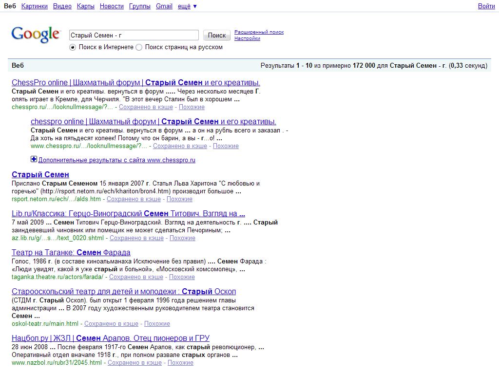 Shaq:На текущий момент Гугл на словосочетание "Старый Семен - гений" выдает 24000 ссылок, но СС, к сожалению, не проходит в указанный мною перечень по ограничивающим параметрам.