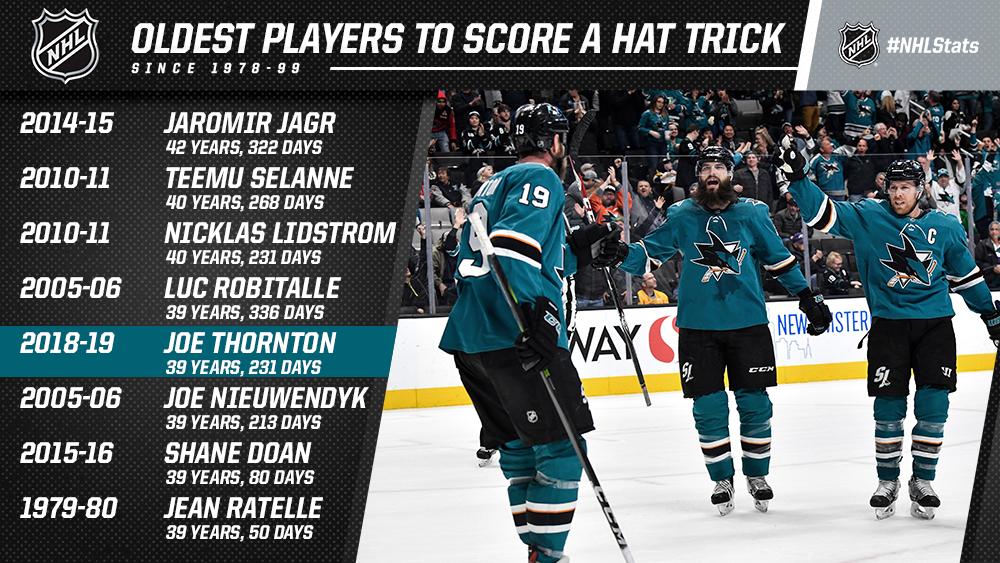 Если уж игрок уровня Джо Торнтона (центр в топ-6) имеет кондиции играть в 39 лет, то он будет и худо-бедно забивать (учитывая игровое время порядка 15-20 минут + место в бригаде большинства). А забивая, он может положить и хет-трик. Сегодняшний хет-трик Торнтона - его пятый хет-трик в карьере и первый с 2010 года!
