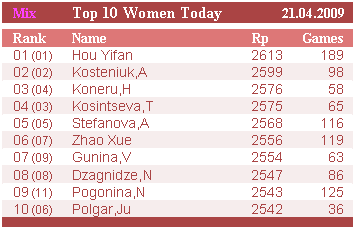 На 1 апреля 2009 года её рейтинг ФИДЕ превысил знаковую отметку 2500 – уровень, традиционно ассоциирующийся со званием гроссмейстера среди мужчин. |
