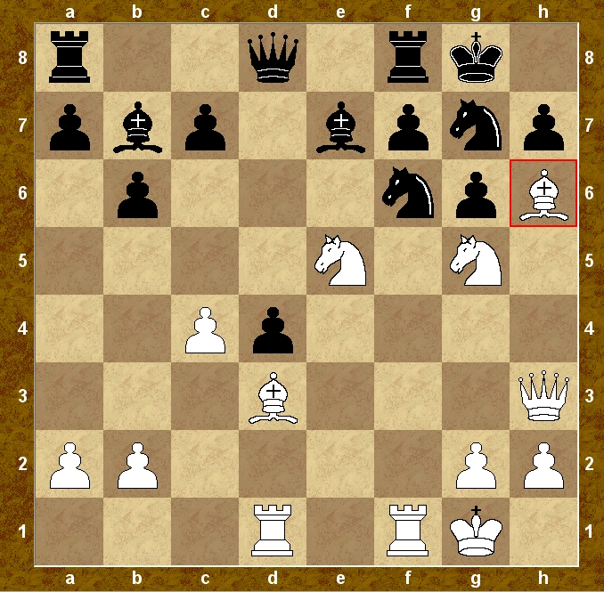 13... Bxh4?? 14. g5 Bxf2+ 15. Kxf2 Nf5 16. Nxf5 exf5