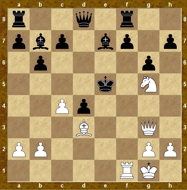 (17... Ke6 18. d5+ Kxd5 (18... Ke5 19. f4+ Kxd5 20. Qf7+ e6 21. Qd7#) 19. Qf7+ e6 (19... Ke5 20. f4#) 20. Qd7+ Ke5 21. f4#)
