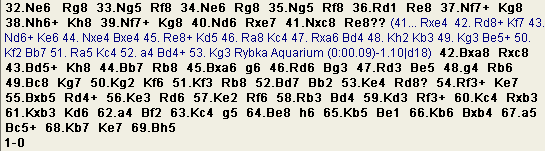 | Хода 31. ..Rg8 не е игран ,защото е помислил ,че получава мат след 31. .. Rg8 32.Ng6+ hg 33.Qh4(#) - просто не е "видял",че офицера от f2 контролира полето h4 и след 33. .. B:h4няма мат. |