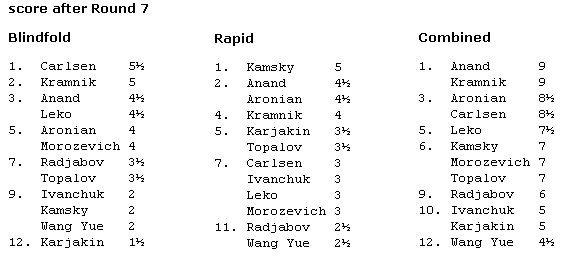 Положение после 7 тура. Крамник, Ананд – по 9; Карлсен, Аронян – по 8,5; Леко – 7,5; Топалов, Камский, Морозевич – по 7; Раджабов – 6; Иванчук, Карякин – по 5, Ван Юэ – 4,5. |