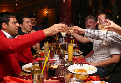Glasses clink and champagne is sipped: That evening Anand and his team celebrate victory |