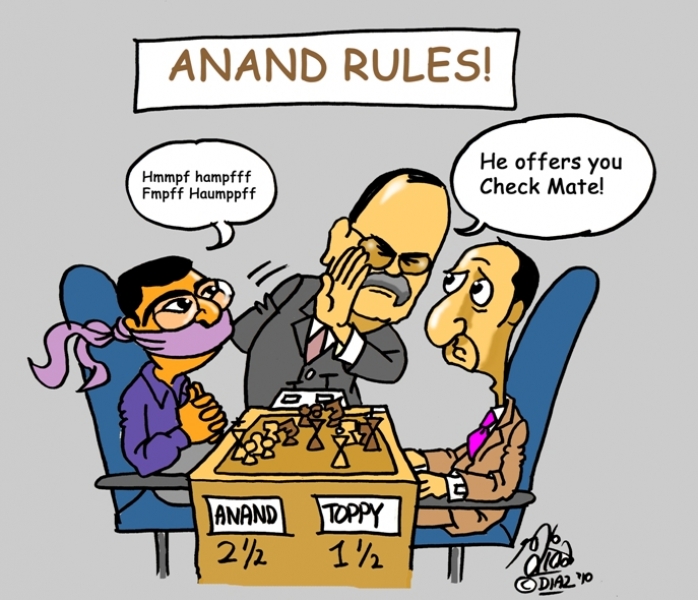 Веселин в интервью ляпнул, что не Ананд выграл, а он проиграл - якобы недобил в 3,5,10 и 11-ой, а Ананд недобил лишь в 9-ой..., что после 1-ой дебютная подготофка Ананда вылетела в окно... |