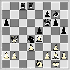 30...Rc1 (с угрозой Кс2) 31.Qd2 (упорство белых в непереводе ферзя на d2 проблем тоже не вызывает: 31.Qa5 Rb8! 32.b3 Rb5 33.Qd2 Rbc5 34.f3 R5c2; 31.Bf1 Rdc8 32.Kg2 R8c2) 31...Rdc8 32.h4 (32.Qe3 Rd1; 32.Qa5 R8c5 33.Qd2 R5c2 34.Qe3 Ne2+ 35.Kf1 Rxb2 36.Rxe5 Nc3 37.Bf3 Rxf2+!).