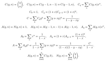(3) S(q,n) = C(q,n) + S(q,n-1) которая превращается в сумму "n" слагаемых вида C(q,k) /биномиальных коэффициентов/, где "k" пробегает все значения от n до 1