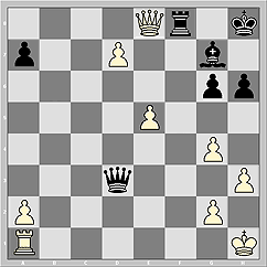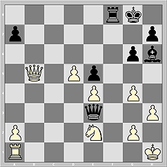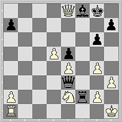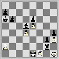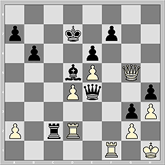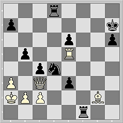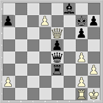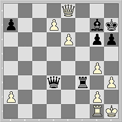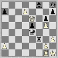 28.Rg1 (28.Qxf8+? Kxf8 29.d8Q+ Kg7 30.Qe7+ Kh6 31.Qh4+, и ничья) 28...Re3 (28...Rd2 29.d8Q Rxd8 30.Qxd8+-) 29.Qe6+! (29.d8Q?? Rxh3#; выгадать пару ходов в цейтноте не удаётся: 29.Kh2? Qf4+ 30.Kh1, и чёрные, «не повторяясь», играют 30…Rxh3+! 31.gxh3 Qf3+ с вечным шахом) 29...Kg7 (слабо 29...Kh8? 30.Qf6+ Kg8 31.Kh2! Rd3 32.Rf1).