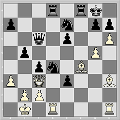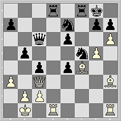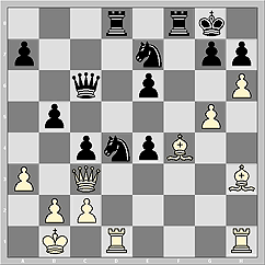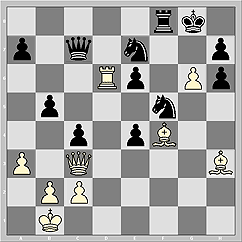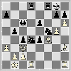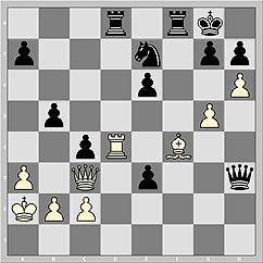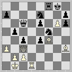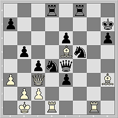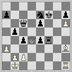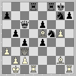 Ясно, что белые пошли в защите Грюнфельда на тот «карповский» вариант (12. Bxf7+), в котором они прихватывают пешечку, но подвергаются нешуточному давлению. К тому же последним своим ходом 24.Qxb5 они увеличивает номинальное превосходство своих сил ещё на одну боевую единичку.