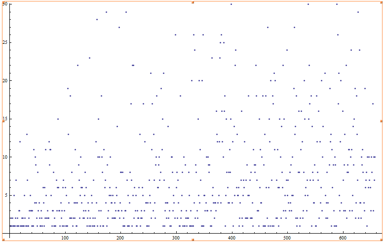 Например, для S(3) последовательность разностей выглядит так - {1,2,1,5,1,2,1,14,1,2,1,5,1,2,1,41,...}. Каждое второе число в ней - единица, но максимум растет очень быстро (линейно). В последовательности разностей S(4) максимум растет гораздо медленнее (разница больше 40 в первый раз возникает в районе 300-го члена), зато в ней встречаются длинные куски без единиц, например {11, 17, 3, 13, 7, 4, 2, 9, 10, 18, 6, 6, 9, 10, 7, 36, 8, 19, 11, 15} (в районе все того же 300-го члена). Насколько это общее наблюдение? |
