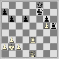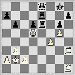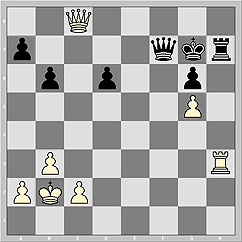 Абсолютно внезапно выяснилось, что грозит элегантный, хотя и несколько «скособоченный» (то есть и повёрнутый на 90 градусов), эполетный мат: 30.Rh8+ Kf7 31.R1h7#. Что могут противопоставить этой угрозе чёрные? Канадский заброс в зону ладьи заканчивается плачевно: 29...Re1 («цепляясь» к белой ладье и одновременно открывая дорожку к спасению своему королю) 30.Rh8+ Kf7 31.R1h7+ Ke6 32.Rxe8+.