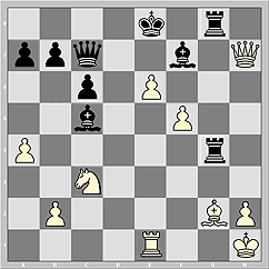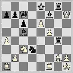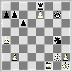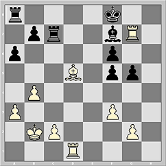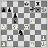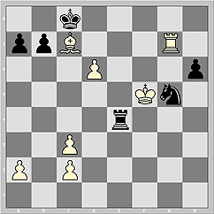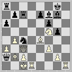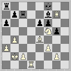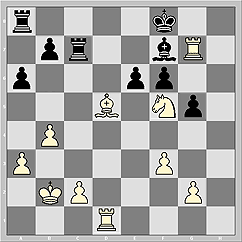 Первый ход - как будто из предыдущей главы: 29.Rh7! «Загородившийся от жизни чернопольный слон дождался смерти! Эффект от этого хода усиливает то обстоятельство, что он - сильнейший и фактически единственный, ведущий к победе», - отмечает С. Шипов. Да ход, лучший. Не проходит, к примеру, упрощающее 29.Nxg7 Kxg7 30.Rh7+ Kf8 31.Rh8+ Bg8 32.Bd5 Kg7 33.Rdh1 Qxb2+ 34.Qxb2 Nxb2 35.Kxb2 Rac8, уравнивая. Далее в поединке было 29...Qxb2+ 30.Qxb2 Nxb2 31.Rxg7+ Kf8 32.Rh1, и черные сдались.