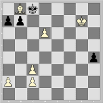 1.Bb8! h3! 2. d7+ K:d7 3.Kf6 a5! (пока белые не могут двигаться королём к пешкам чёрные выигрывают важный темп) 4.Bh2 Kc6 5. Ke6 Kc5 6. Kd7 Kc4 7. Kc7 K:c3 8. K:b7 (8.Kb6 a4) K:c2 9.Kb6 a4 и ничья |