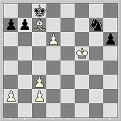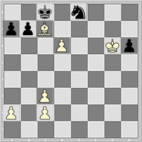 37.Kf6! Типичный манёвр «а ля Рети»! Король и на коня поглядывает и про свою проходную не забывает. Нехорошо 37.Kg6? И теперь проще всего 37...Ne6! 38.Ba5 Kd7 39.Bb4 Nf4+ 40.Kf5!? Nd5, но ходом 37…Ne8, вполне допустимом в анализе, проводимым перворазрядником, пусть даже и «опытным», чёрные заставляют напрягаться и себя и соперника в поисках этюдных красот.