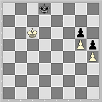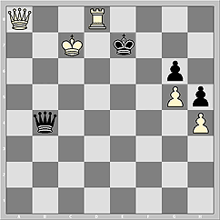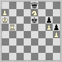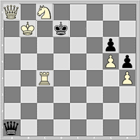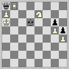 Гм-м. Если на доске (в позиции на последней диаграмме) кое-что убрать (пешки h4, h5, коня с с8) и кое-что добавить (к примеру, пешку на f4), то получается уж точно этюдный механизм вечного шаха: чёрные ферзь по трём углам шахматной доски, угрожая белому визави, расположенному в четвёртом!