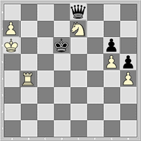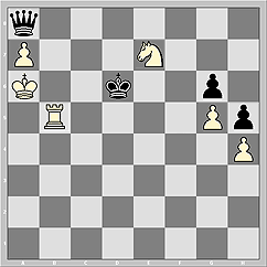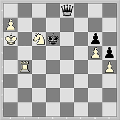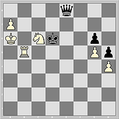 Красиво и чётко, как на параде, строятся в победные колоны фигуры белых и после 74...Ke6 75.Nd5 Qc8+ 76.Ka5 Kd6 77.Nb6 Qc3+ 78.Rb4 Qc5+ 79.Ka4 Qc2+ 80.Rb3 Qa2+ 81.Kb4 81...Qd2+ 82.Kb5. Это на первый взгляд. А если подумать?