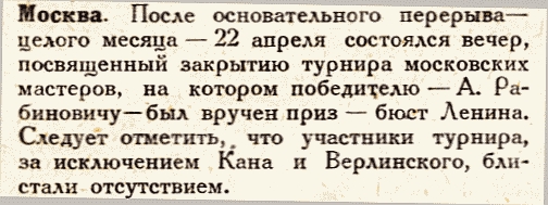 Pirron, а призы какие? Это потому что Ленин хорошо в шахматы играл. А Рабинович показал содержательную игру. Я представляю себе,как Рабинович был доволен. Как бережно он его нёс. Не дай Бог было поскользнуться и выронить. Разве такие призы сейчас вручают? А знаете, у меня идея. Закончится Высшая лига и на закрытии вручить Яну Непомнящему бюст. Бюст... Бюст Алёхина. А Вы кого подумали?