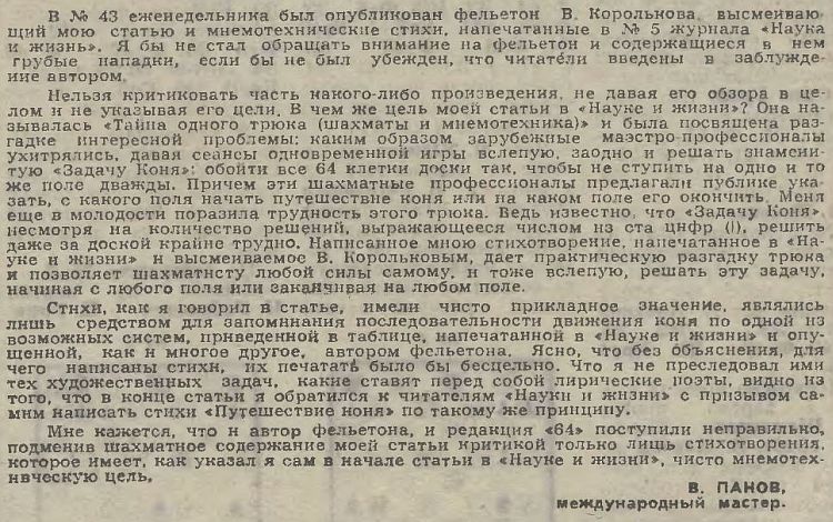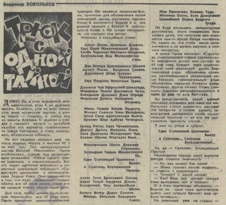 Нет, задачу придумал, конечно, не Пильсбери. Просто он решал ее вслепую, начиная с указанной зрителями клетки доски. И, насколько я помню, Панов был уверен, что открыл секрет – Пильсбери решал эту задачу с помощью мнемотехники. И сочинил соответствующие стихи. |