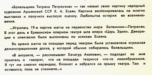 | Так или иначе, шахматы и национальная гордость сплелись вместе в 1963 году, когда Петросян бросил вызов Михаилу Ботвиннику. Матч проходил в Москве. А в Ереване толпы людей собирались на центральной площади, где была установлена огромная доска. Ходы передавались по телексу и обсуждались так, как будто это были военные сводки. |