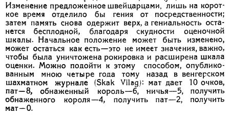 Швейцарские шахматисты предлагали для устранения механичности шахматной игры сделать ныне строго единообразное начальное положение эластичным. Это предложение, на мой взгляд, не уничтожает зла в корне. Через сравнительно недолгий срок шахматисты создадут теорию, которая сможет быть удобно применена, и нынешнее зло, именно то, что скудная шкала современной игры ограничивает поле действия, - вновь парализует фантазию.