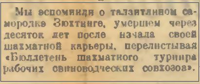 | Sidoroff: "...4-й номер газеты «64» от 20 января не содержал ни одного слова о шахматах. Он целиком был посвящен итогам сессии Верховного Совета СССР и решениям очередного Пленума ЦК ВКП(б)." |