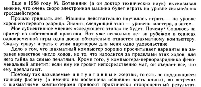 В 60-70-е годы сильные шахматисты обычно играли в показательных матчах против суперкомпьютеров. Но 80-е, после широкого распространения микропроцессоров, гроссы и мастера стали больше играть против так называемых "шахматных досок", а они то поначалу были совсем слабы. Поэтому для тех шахматистов кто не следил за данной темой, могло сложиться впечатление, что никакого прогресса и нет. На самом деле, конечно программы для суперкомпьютеров никуда не девались, просто начали постепенно отходить в тень перед коммерческими машинами. Реально, лучшие машины достигли уровня кмс уже в начале 80-х, в середине десятилетия играли на уровне мс, а в конце 80-х на уровне мм.