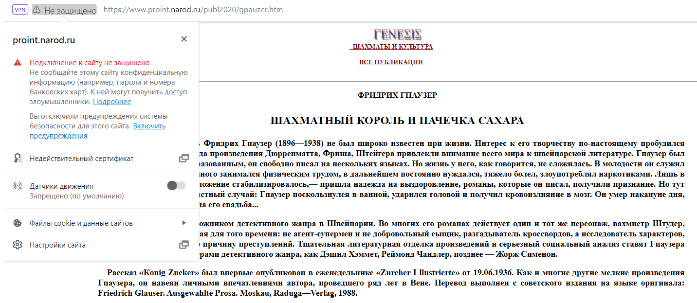 Небольшая поправочка - ГЛаузер - Friedrich Charles Glauser. Помню этого рассказа, у меня наверно еще есть тот номер Шахматы в СССР, где он был опубликован. По-видимому Глаузер неплохо разбирался в шахматах |